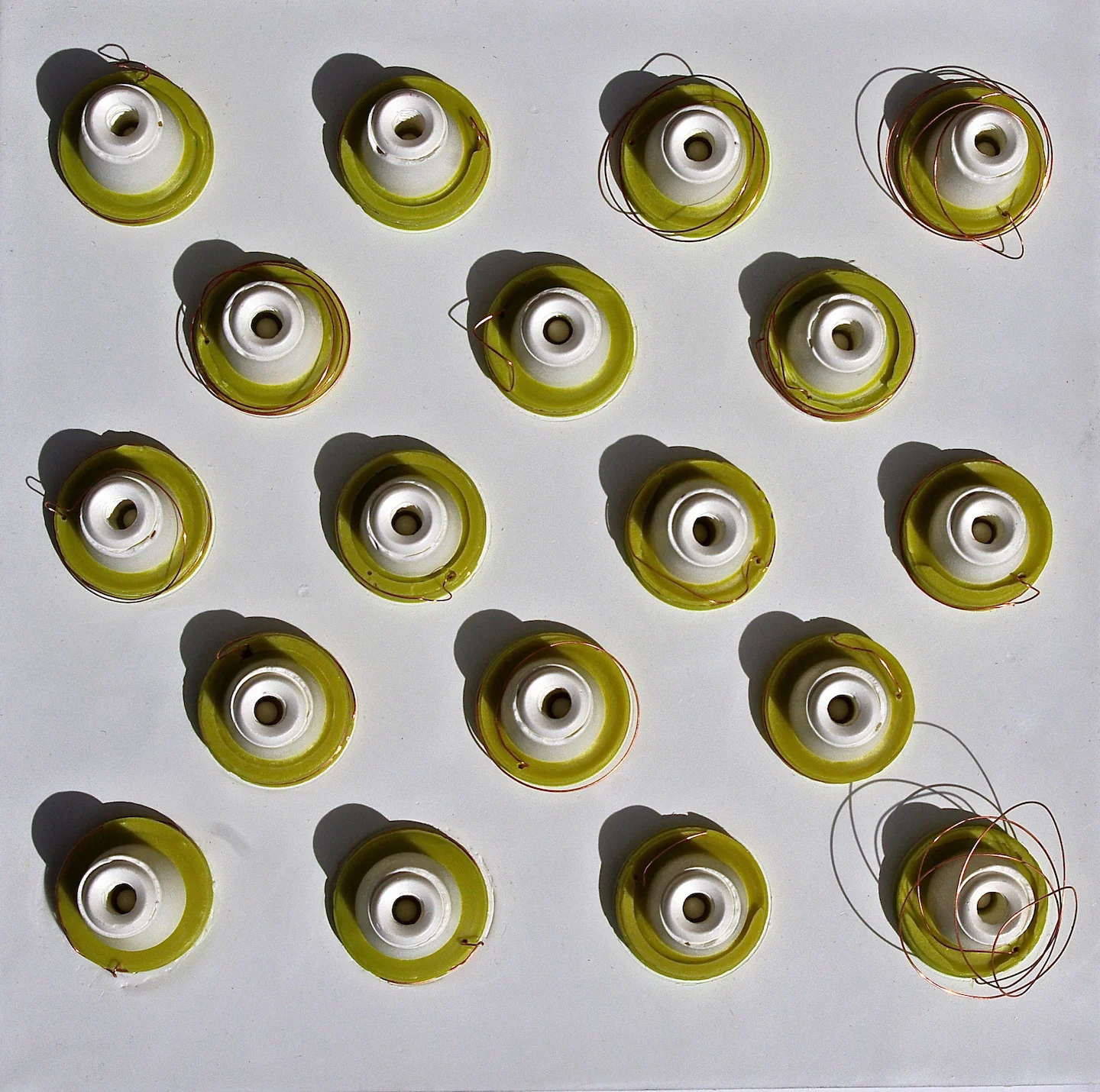 Encaustic with bb's, copper wire, metal mesh. Various sizes.